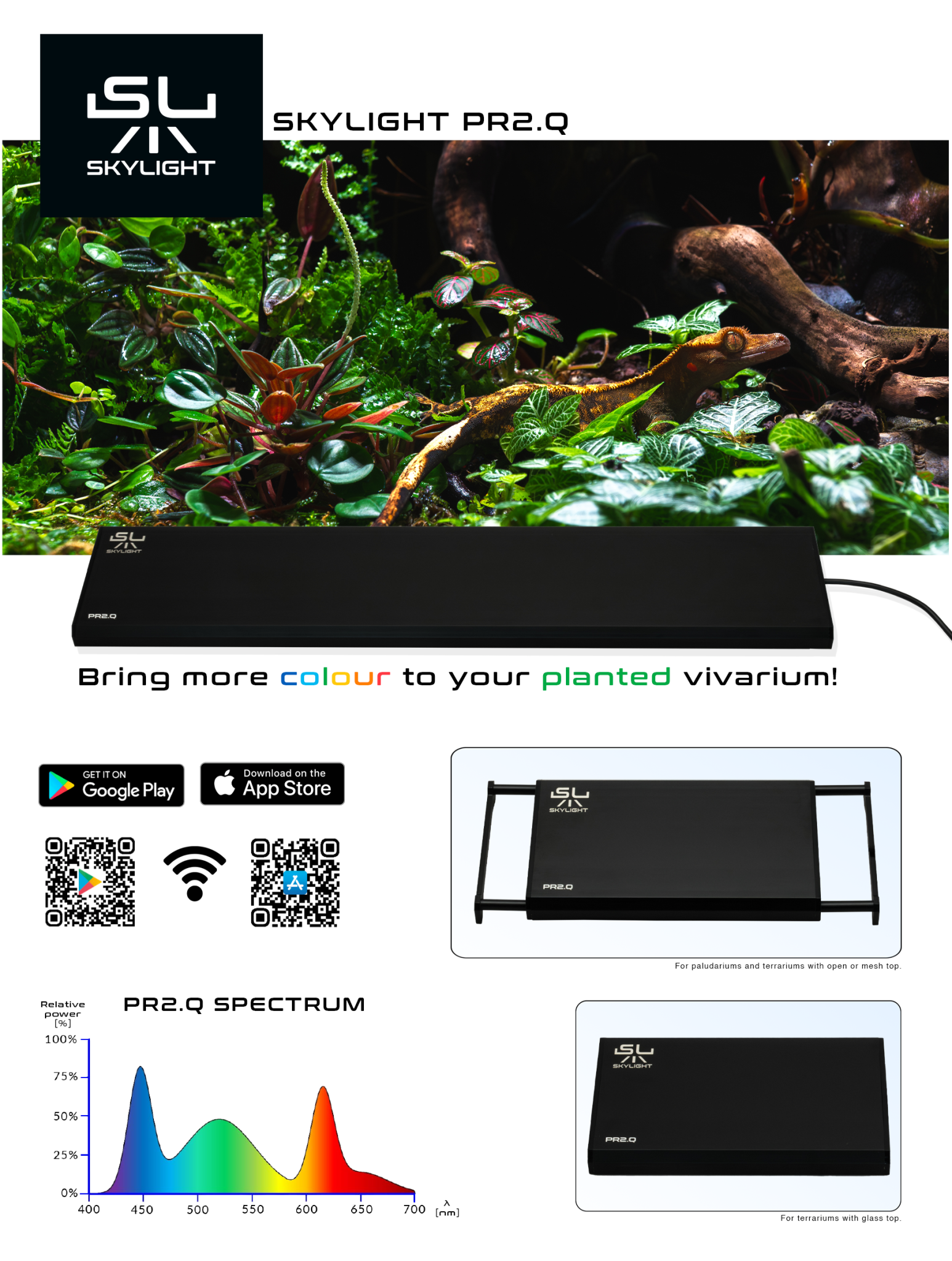 La PR2.Q es una lámpara diseñada para terrarios y paludarios plantados, capaz de afrontar prácticamente cualquier desafío. Su diseño robusto y resistente a salpicaduras, combinado con una altísima eficiencia de aproximadamente 100 lm/W y un alto factor de protección fotovoltaica (FPP)/W (PAR), la hace ideal para iluminar los tamaños más comunes de paludarios y vivarios con plantas vivas.